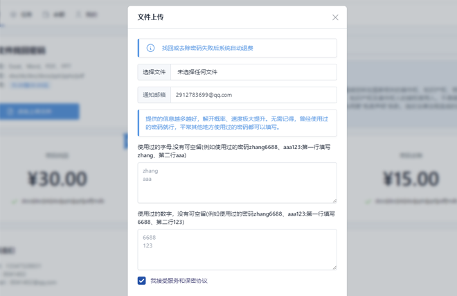 通过尝试字典内所有组合进行密码解除,我们提供内置字典,您也可以自行导入字典进行恢复。
